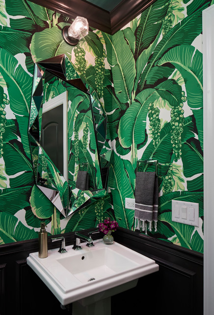 Draper designed this vibrant banana-leaf wallpaper, Brazilliance, for Arrowhead Springs and used it again in the mid-1940s when she worked on the luxurious casino hotel Palácio Quitandinha near Rio de Janeiro, another magnet for the jet set. And Varney added it to The Greenbrier during a 2009 renovation. Here, it brightens the powder room of a Chicago home by Dan Rak Design.
