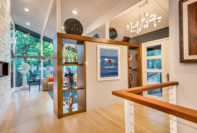 Ammirato Construction built this airier version of a storage wall for its gut remodel of a midcentury modern house in California. The open cubbies and shorter-than-ceiling height allow light to permeate the entry.