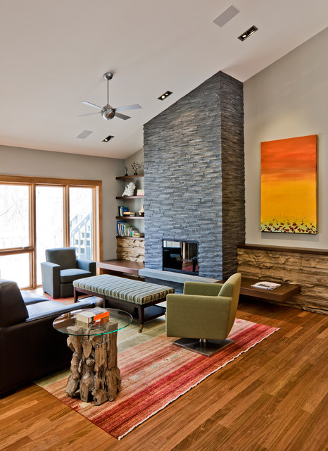 Opposite the display shelves is a casual seating area in front of a fireplace made over with textured stone, reclaimed wood and a steel bench.