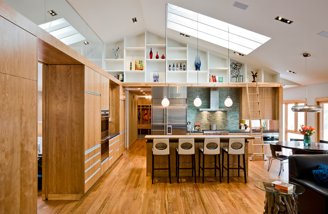 Peterssen/Keller Architecture, Eminent Interior Design and Streeter & Associates teamed up to create this hardworking hub for a Minneapolis family of six. It centers around the kitchen. Behind the red birch storage wall at left is an open living-dining room that is buffered from sound by a glass partition and a thick, 6-foot-wide pocket door. At right is a casual dining area and a 12-foot-wide folding door connecting to a porch and deck.