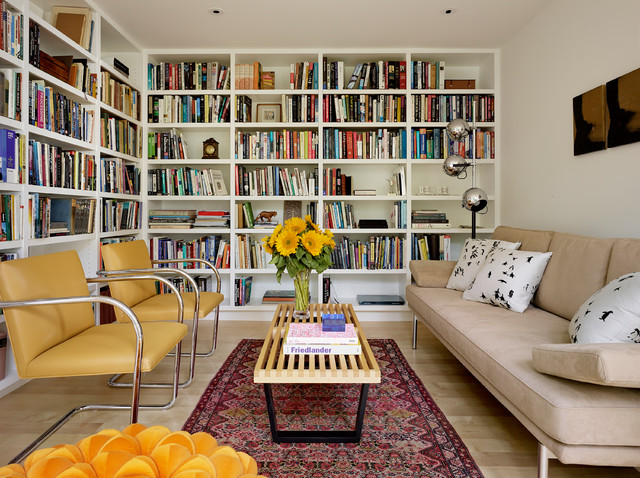 As the Life article pointed out, the storage wall is a flexible device that can work almost anywhere. McCrum Interior Design used one in this London apartment to separate the living and sleeping areas. The square central section swivels to allow the TV to be viewed from either side.